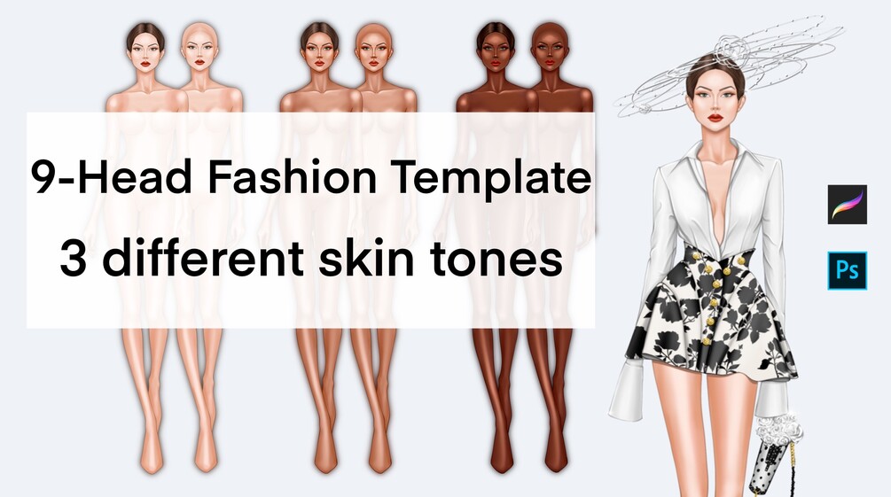 Female Fashion Croquis Templates, 9 Head Fashion Figure, 3 Different Colored Skin Tones