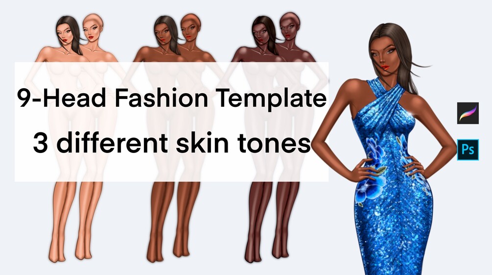 Female Fashion Croquis Templates, 9 Head Fashion Figure, 3 Different Colored Skin Tones