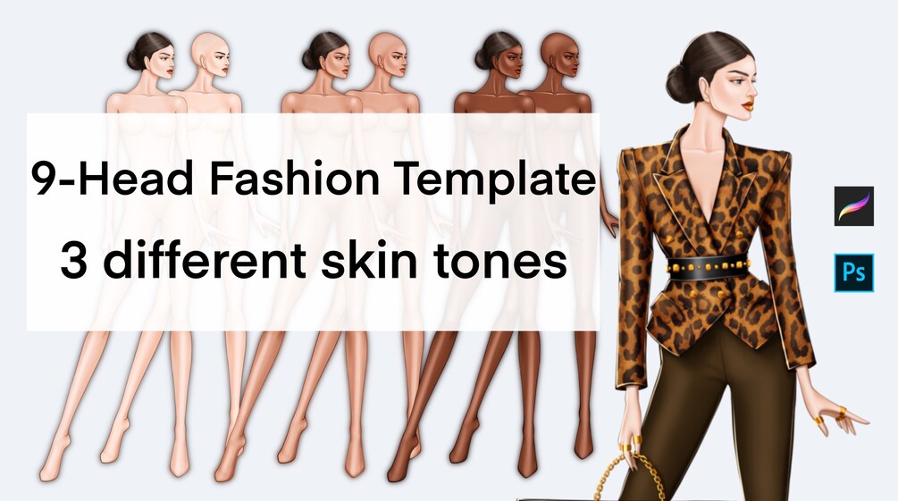 Female Fashion Croquis Templates, 9 Head Fashion Figure, 3 Different Colored Skin Tones